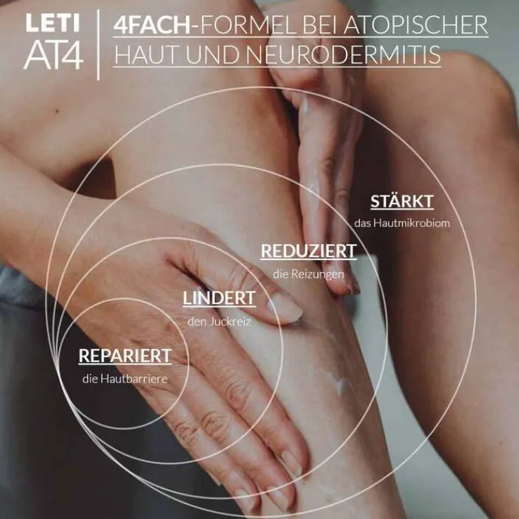 LETI AT4 Körpercreme hilft gegen die 4 Symptome atopischer Haut: Sie stellt die Hautbarriere wieder her, lindert den Juckreiz, schützt vor reizenden Einflüssen und reduziert das Risiko von Superinfektionen.