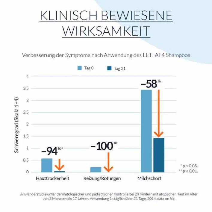 letiAT4 Shampoo ist eine spezielle Haar- und Kopfhautpflege für Säuglinge, Kinder und Erwachsene mit den Zeichen atopischer Haut.