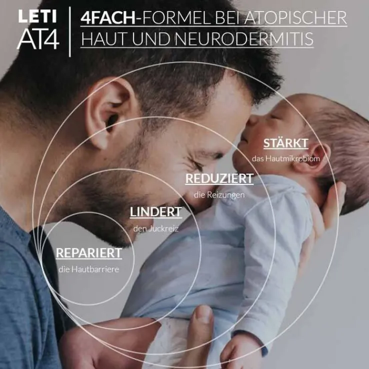 LETI AT4 Windelcreme besitzt eine spezifische Formel zur regenerierenden Hautpflege im Windelbereich für Neugeborene und Säuglinge mit empfindlicher oder atopischer Haut. Durch die innovative Formel werden die wichtigsten Ursachen von Reizungen, Hautausschlägen und Rötungen im Windelbereich bekämpft.