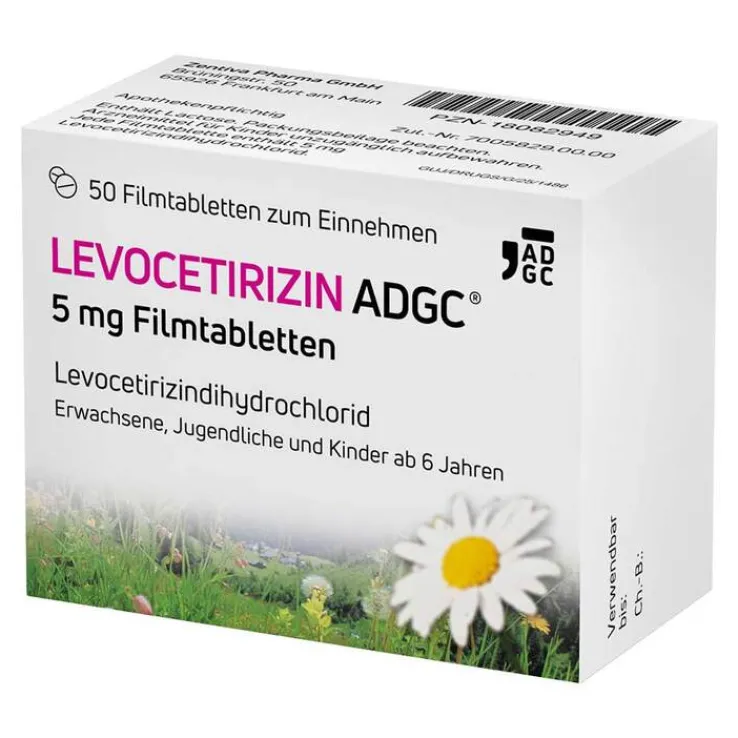 LEVOCETIRIZIN ADGC® 5 mg Filmtabletten. Wirkstoff: Levocetirizindihydrochlorid. Anwendungsgebiete: Zur symptomatischen Behandlung der allergischen Rhinitis (einschließlich persistierende allergische Rhinitis) und Urtikaria bei Erwachsenen, Jugendlichen und Kindern ab 6 Jahren. Hinweis: Enthält Laktose, Packungsbeilage beachten. Apothekenpflichtig. Zu Risiken und Nebenwirkungen lesen Sie die Packungsbeilage und fragen Sie Ihre Ärztin, Ihren Arzt oder in Ihrer Apotheke. Pharmazeutischer Unternehmer: Zentiva Pharma GmbH, 65926 Frankfurt am Main. Stand: November 2022