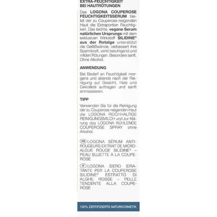 Bei Bedarf an Feuchtigkeit das Serum morgens und abends auf das gereinigte Gesicht auftragen und sanft einmassieren. Anschließend die Logona Med Couperose Pflegecreme Rotalgenextrakt Silidine verwenden.