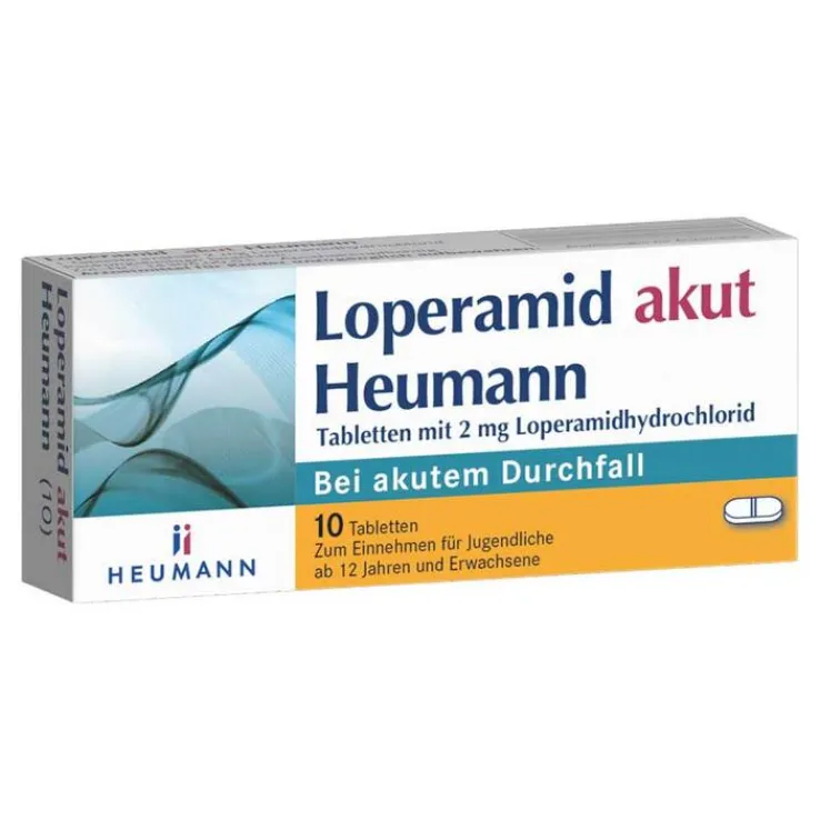 Loperamid akut Heumann, Tabletten mit 2 mg Loperamidhydrochlorid (Wirkstoff: Loperamidhydrochlorid) Zur Anwendung bei Jugendlichen ab 12 Jahren und Erwachsenen. Anw.: Zur symptomatischen Behandlung von akuten Durchfällen, sofern keine ursächliche Therapie zur Verfügung steht. Eine über 2 Tage hinausgehende Behandlung mit Loperamid darf nur unter ärztlicher Verordnung und Verlaufsbeobachtung erfolgen. Stand: 11/2023 Zu Risiken und Nebenwirkungen lesen Sie die Packungsbeilage und fragen Sie Ihre Ärztin, Ihren Arzt oder in Ihrer Apotheke.