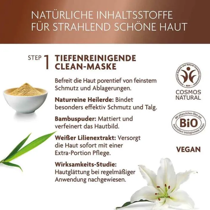 In der Clean-Maske mit weißem Lilien-Extrakt bindet die naturreine Heilerde durch ihre enorme Saugkraft im Mix mit mattierendem Bambuspuder Schmutz, Talg und Ablagerungen und reinigt so gründlich. Das glättet die Hautoberfläche.