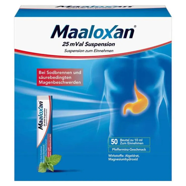 Maaloxan® 25 mVal Suspension. Wirkstoffe: Algeldrat, Magnesiumhydroxid. Anw.-geb.: Zur symptomat. Behandl. von Erkrankungen, bei denen die Magensäure gebunden werden soll: Sodbrennen und säurebedingte Magenbeschwerden, Magen- oder Zwölffingerdarmgeschwüre (Ulcus ventriculi und Ulcus duodeni). Hinweise: Nicht bei Kindern unter 12 Jahren anwenden. Beschwerden, die länger als 2 Wochen bestehen, klinisch abklären lassen. Enthält Sorbitol, Pfefferminzöl, Methyl-4-hydroxybenzoat und Propyl-4-hydroxybenzoat (Parabene). Die Einnahme anderer Arzneimittel sollte grundsätzlich mindestens 2 h vor oder nach Einnahme von Maaloxan Suspension erfolgen. Apothekenpflichtig. Zu Risiken und Nebenwirkungen lesen Sie die Packungsbeilage und fragen Sie Ihre Ärztin, Ihren Arzt oder in Ihrer Apotheke. A. Nattermann & Cie. GmbH, Brüningstraße 50, 65929 Frankfurt am Main. Stand: Juli 2022. MAT-DE-2001977