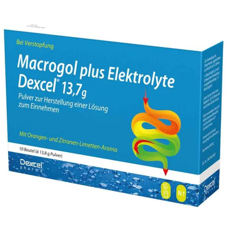 Macrogol plus Elektrolyte Dexcel® 13,7 g Pulver zur Herstellung einer Lösung zum Einnehmen. Wirkstoffe: Macrogol 3350, Natriumchlorid, Natriumhydrogencarbonat, Kaliumchlorid Anwendungsgebiete: chronische Verstopfung bei Erwachsenen und Kindern ab 12 Jahren. Hinweis: Hoher Natriumgehalt. Enthält Sorbitol und Kalium. Zu Risiken und Nebenwirkungen lesen Sie die Packungsbeilage und fragen Sie Ihren Arzt oder Apotheker. Dexcel® Pharma GmbH, 63755 Alzenau Stand: November 2022.