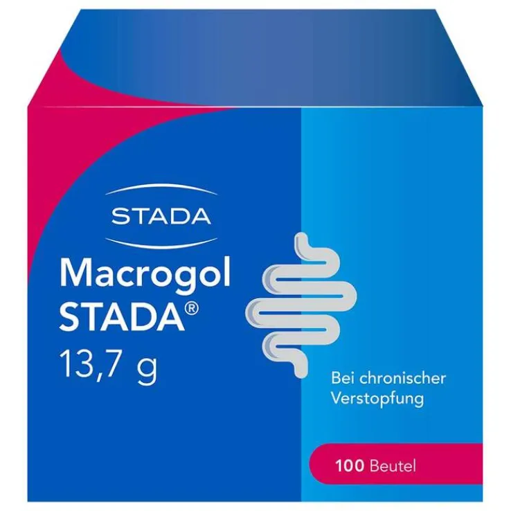 Macrogol STADA® 13,7 g Pulver zur Herstellung einer Lösung zum Einnehmen. Wirkstoffe: Macrogol 3350, Natriumchlorid, Natriumhydrogencarbonat, Kaliumchlorid. Abführmittel zur Behandlung der chronischen Verstopfung bei Erwachsenen, Kindern ab 12 Jahren und älteren Patienten. Es verhilft Ihnen zu einer unproblematischen Darmtätigkeit, selbst wenn Sie bereits über einen langen Zeitraum unter Verstopfung gelitten haben. Es wirkt auch bei einer sehr schlimmen Verstopfung, die als Stuhlverhaltung (komplette schwere Verstopfung) bezeichnet wird. Hinweis: Hoher Natriumgehalt. Enthält Kalium. Bei Kindern unter 12 Jahren nicht empfohlen. Zu Risiken und Nebenwirkungen lesen Sie bitte die Packungsbeilage und fragen Sie Ihren Arzt oder Apotheker. STADA Consumer Health Deutschland GmbH, Stadastraße 2–18, 61118 Bad Vilbel. Stand: November 2022