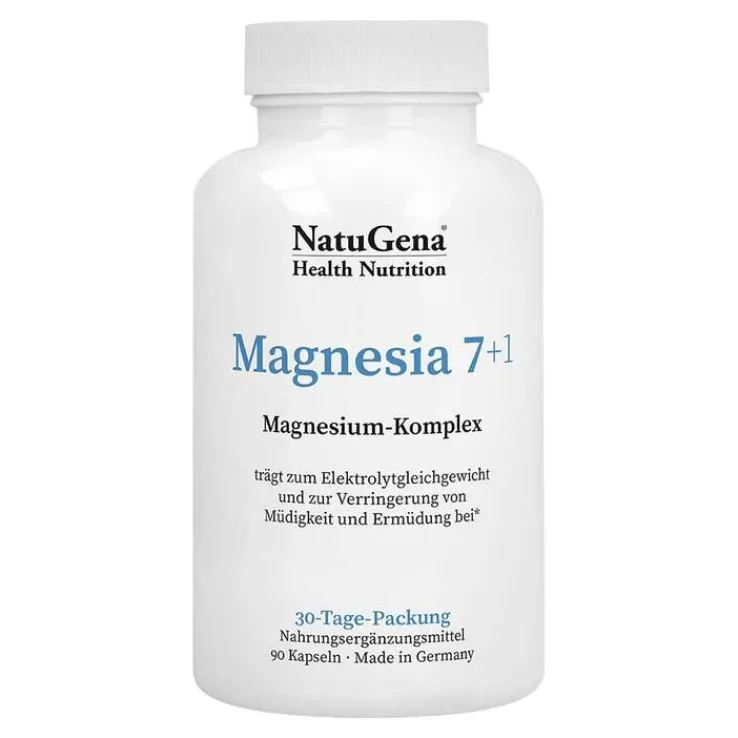 Magnesia 7+1 ist ein optimal abgestimmter Magnesium-Komplex mit acht verschiedenen Magnesiumverbindungen, darunter Magnesiumcitrat, Magnesiumbisglycinat, Magnesiummalat, Magnesiumlactat, Magnesiumgluconat, Magnesiumcarbonat, Magnesiumphosphat und Magnesiumtaurat. Die unterschiedlichen Magnesiumverbindungen aus organischen und anorganischen Quellen sorgen für eine optimale Magnesiumversorgung, unabhängig vom pH-Wert im Magen-Darm-Trakt.