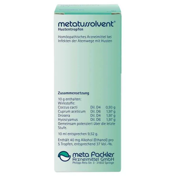 metatussolvent® Hustentropfen.Die Anwendungsgebiete leiten sich von den homöopathischen Arzneimittelbildern ab. Dazu gehören: Besserung der Beschwerden bei Infekten der oberen Atemwege mit Husten. Enthält 40 mg Alkohol (Ethanol) pro 5 Tropfen, entsprechend 37 Vol.-%. Zu Risiken und Nebenwirkungen lesen Sie die Packungsbeilage und fragen Sie lhre Ärztin, lhren Arzt oder in lhrer Apotheke. meta Fackler Arzneimittel GmbH, D-31832 Springe.