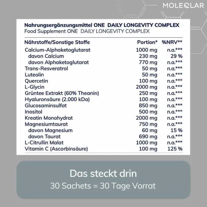 Das ONE – der tägliche Longevity Komplex von MoleQlar – wurde in Zusammenarbeit mit Experten entwickelt. In der Formulierung steckt alles drin was MoleQlar ausmacht: Longevity-Innovationsgeist, aktuelle Wissenschaft und überragende Qualität. Ein Sachet am Tag versorgt dich mit 13 hochwertigen Longevity-Molekülen:
