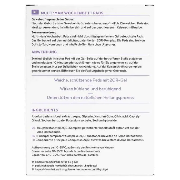 Die Pads eignen sich auch für die Narbenpflege nach einem Kaiserschnitt. Sie können die gebrauchsfertigen Pads auf die geschlossene Kaiserschnittnarbe legen, zur Kühlung und Beruhigung. Die Wochenbett Pads basieren auf natürlichen Inhaltsstoffen, enthalten den natürlichen patentierten 2QR-Komplex auf Aloe-Basis.