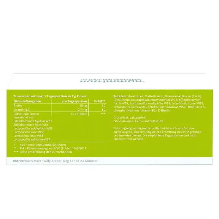 Maisstärke, Maltodextrin, Bakterienkulturen (2,6%) (bestehend aus Bifidobacterium bifidum W23, Bifidobacterium lactis W51, Lactobacillus acidophilus W55, Lactobacillus casei W56, Lactococcus lactis W58, Lactobacillus salivarius W57), Riboflavin-5-phosphat-Natrium (Vitamin B2), D-Biotin