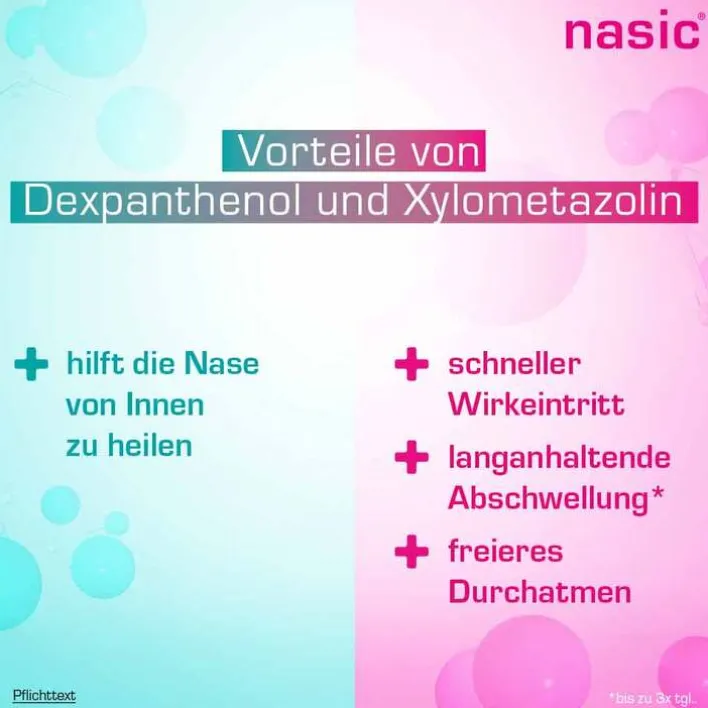 nasic® für Kinder. Anwendungsgebiete: Zur Abschwellung der Nasenschleimhaut bei Schnupfen und zur unterstützenden Behandlung der Heilung von Haut- und Schleimhautschäden, anfallsweise auftretendem Fließschnupfen und zur Behandlung der Nasenatmungsbehinderung nach operativen Eingriffen an der Nase. Zur Abschwellung der Nasenschleimhaut bei Schnupfen in Verbindung mit akuten Entzündungen der Nasennebenhöhlen. nasic® für Kinder ist für Kinder zwischen 2 und 6 Jahren bestimmt. Zu Risiken und Nebenwirkungen lesen Sie die Packungsbeilage und fragen Sie Ihre Ärztin, Ihren Arzt oder in Ihrer Apotheke.