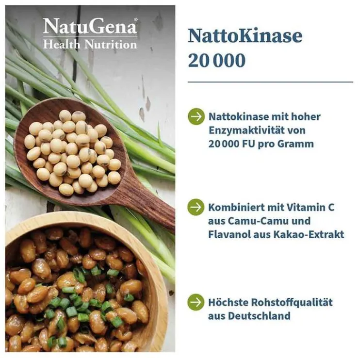 NatuGena NattoKinase 20 000 kombiniert Nattokinase mit Kakao-Extrakt (50 % Flavanole) und natürlichem Vitamin C aus Camu-Camu-Extrakt. Das enthaltene Vitamin C trägt zu einer normalen Kollagenbildung für eine normale Funktion der Blutgefäße bei.