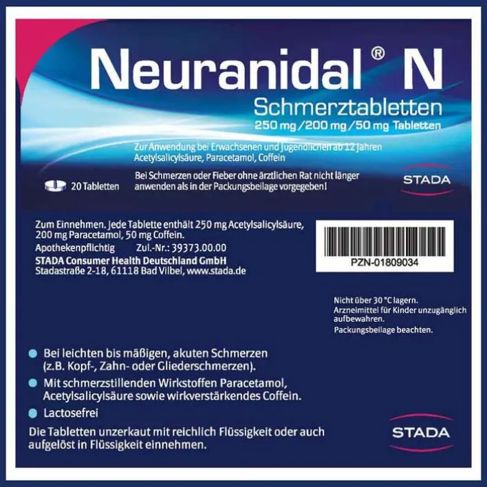 Neuranidal® N Schmerztabletten 250 mg/200 mg/50 mg Tabletten Wirkstoffe: Acetylsalicylsäure, Paracetamol, Coffein. Für Erwachsene und Jugendliche ab 12 Jahren bei akuten leichten bis mäßig starken Schmerzen. Hinweis: Bei Schmerzen oder Fieber ohne ärztlichen Rat nicht länger an-wenden als in der Packungsbeilage vorgegeben! Zu Risiken und Nebenwirkungen lesen Sie die Packungsbeilage und fragen Sie Ihre Ärztin, Ihren Arzt oder in Ihrer Apotheke. STADA Consumer Health Deutschland GmbH, Stadastraße 2–18, 61118 Bad Vilbel Stand: März 2024