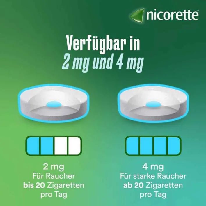 Wähle die für dich geeignete Wirkstärke: Die Lutschtabletten mit 2 mg Nikotin eignen sich für Personen, die bis zu 20 Zigaretten täglich rauchen. Werden mehr als 20 Zigaretten pro Tag geraucht, empfehlen sich die höher dosierten Lutschtabletten mit 4 mg Nikotin.