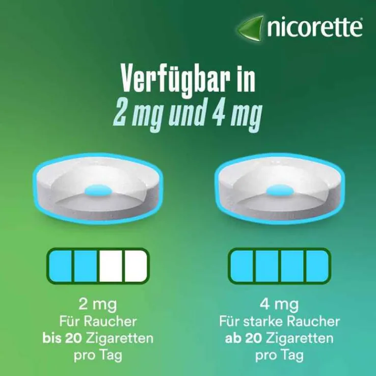 Wähle die für dich geeignete Wirkstärke: Werden mehr als 20 Zigaretten pro Tag geraucht, empfehlen sich die höher dosierten Lutschtabletten mit 4 mg Nikotin, die in Packungen zu 80 Stück erhältlich sind. Die Lutschtabletten mit 2 mg Nikotin eignen sich für Personen, die bis zu 20 Zigaretten täglich rauchen.