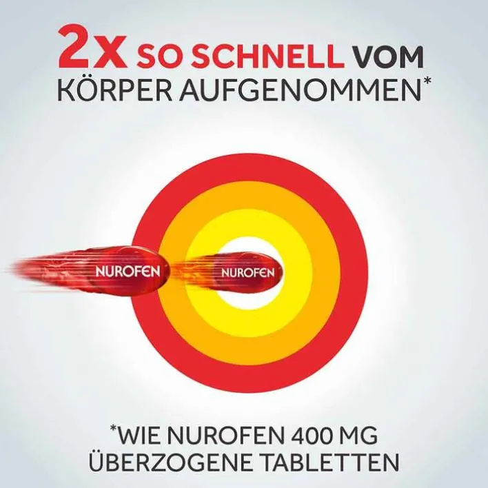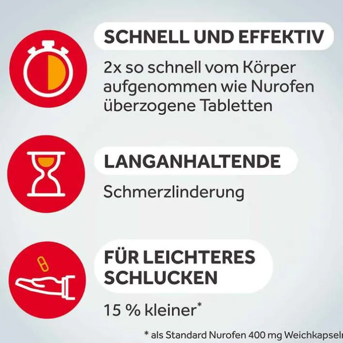Durch das Ibuprofen in gelöster Form kann der Wirkstoff schnell vom Körper aufgenommen werden. Die weichen NUROFEN® MINI Kapseln sind 15 % kleiner als NUROFEN® 400 mg Weichkapseln, wodurch das Medikament leichter zu schlucken ist als gewöhnliche Schmerztabletten.