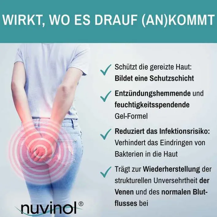 Das Nuvinol Hämorrhoiden- und Analfissuren-Gel ist ein EU-zertifiziertes Medizinprodukt zur Behandlung äußerer Hämorrhoiden und Analfissuren. Das Hämorrhoiden-Gel lindert anale Beschwerden wie Juckreiz, Brennen, Schwellungen, Schmerzen und Reizungen sowie Blutungen. Die spezielle Gel-Formel bildet eine Schutzschicht auf der gereizten Haut, die feuchtigkeitsspendende Eigenschaften besitzt und somit effektiv Reizungen durch Flüssigkeiten aus dem Stuhl reduziert. Ebenfalls mindert das Hämorrhoidengel das Infektionsrisiko, indem es das Eindringen von Bakterien in die Haut verhindert. Zusätzlich sorgt es für eine glättende Wirkung bei hartem Stuhl.