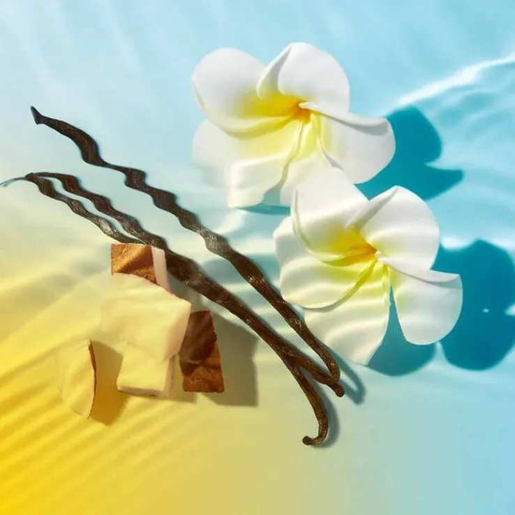 Die Haut wird in einen Urlaubsduft gehüllt, basierend auf Noten von Süßorange, Tiare-Blüten und Vanille.