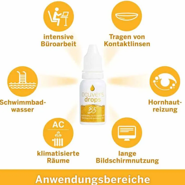 Ocuvers drops B5 Augentropfen werden eingesetzt bei trockenen, müden oder gereizten Augen. Diese Beschwerden können aufgrund äußerer Einflüsse, wie Umgebungsluft, Tabakrauch oder Pollen verursacht werden. Ocuvers drops B5 Augentropfen bestehen aus einer sterilen, viskösen Lösung auf der Basis von Provitamin B5. Dieser fördert und unterstützt die selbstregenerierenden Eigenschaften der Hornhaut. Die Augentropfen sind geeignet für die Anwendung mit allen Kontaktlinsentypen.