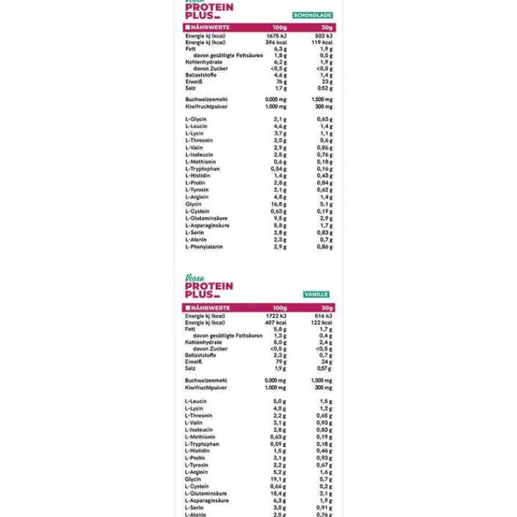 Ackerbohneneiweiß, Erbseneiweißisolat, Glycin, Reiseiweiß, fettarmes Kakaopulver,Sonnenblumeneiweiß, Buchweizenmehl, natürliches Aroma (enthält Sulphite), Kiwifruchtpulver, Süßungsmittel (Steviolglykoside aus Stevia)
