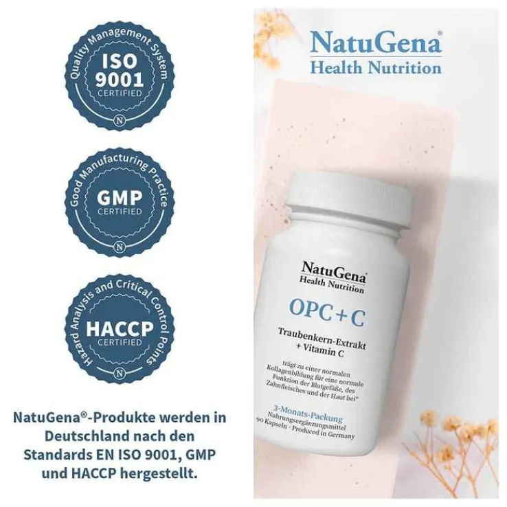 OPC+C besteht aus französischem Traubenkern-Extrakt kombiniert mit dem Co-Faktor Vitamin C aus natürlicher Hagebutte.