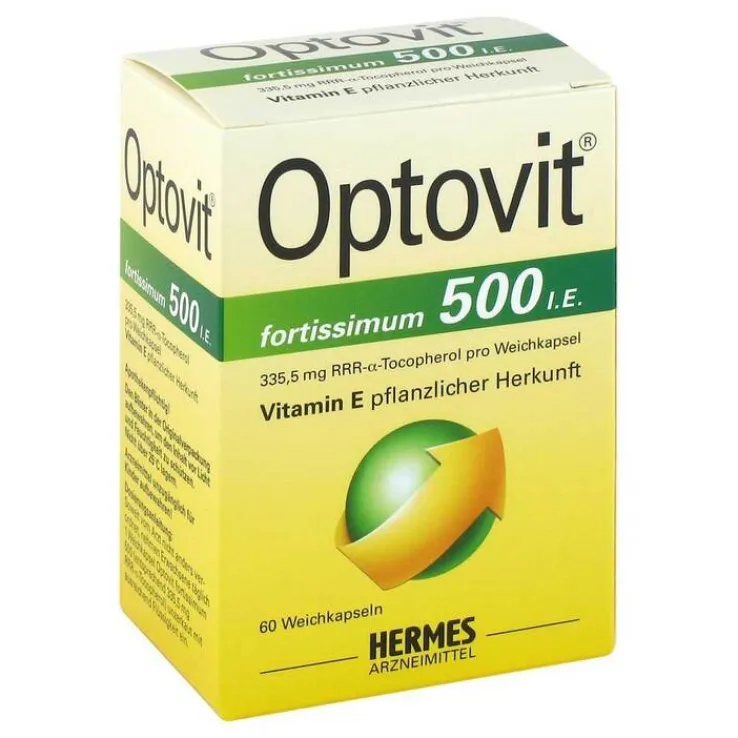 Optovit® fortissimum 500. Wirkstoff: RRR-alpha-Tocopherol (Vitamin E). Anwendungsgebiete: Optovit® fortissimum 500 ist ein Vitaminpräparat zur Behandlung eines Vitamin E-Mangels. Optovit® fortissimum 500 ist nicht geeignet zur Behandlung von Vitamin E-Mangelzuständen, die mit einer gestörten Aufnahme von Vitamin E aus dem Darm einhergehen. In diesen Fällen stehen parenterale Zubereitungen (Spritzen) zur Verfügung. Enthält Sorbitol und Sojaöl. Sojaöl (Ph. Eur.) kann sehr selten allergische Reaktionen hervorrufen. Packungsbeilage beachten. Zu Risiken und Nebenwirkungen lesen Sie die Packungsbeilage und fragen Sie Ihre Ärztin, Ihren Arzt oder in Ihrer Apotheke. HERMES ARZNEIMITTEL GMBH, 82049 Großhesselohe/München