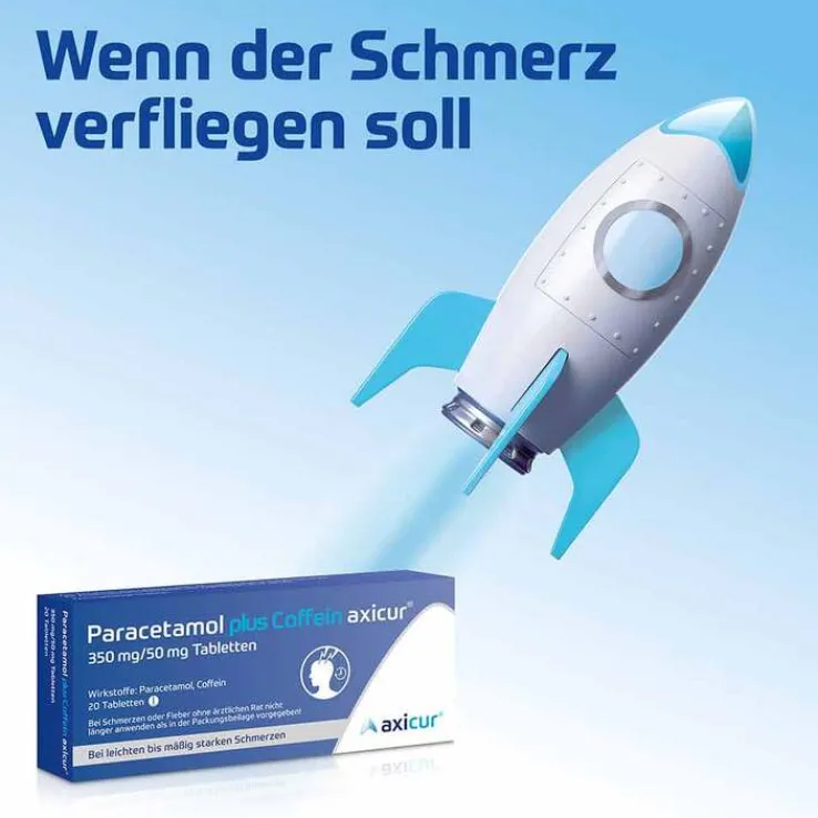 Paracetamol plus Coffein axicur® 350 mg/50 mg Tabletten. Wirkstoffe: Paracetamol, Coffein. Anwendungsgebiete: Kombination aus einem schmerzstillenden, fiebersenkenden Wirkstoff und Coffein. Anwendung zur symptomatischen Behandlung von leichten bis mäßig starken Schmerzen (wie Kopfschmerzen, Zahnschmerzen, Regelschmerzen). Bei Schmerzen oder Fieber ohne ärztlichen Rat nicht länger anwenden als in der Packungsbeilage vorgegeben! Zu Risiken und Nebenwirkungen lesen Sie die Packungsbeilage und fragen Sie Ihre Ärztin, Ihren Arzt oder in Ihrer Apotheke. axicorp Pharma GmbH, 61381 Friedrichsdorf. Stand: Mai 2022