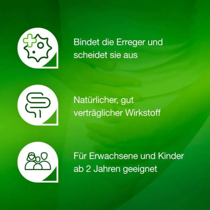 - Das Arzneimittel bindet die Durchfallerreger und unterstützt Ihren Darm dabei, die Erreger auszuscheiden. Dies trägt zur sanften Linderung der Beschwerden bei.