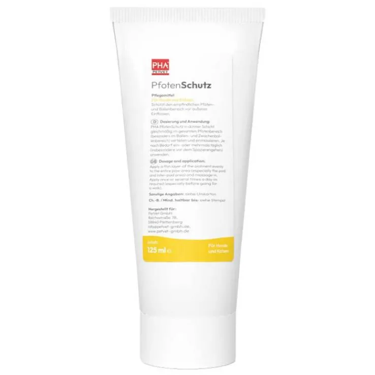 Die in PHA PfotenSchutz enthaltenen ausgewählten Inhaltsstoffe pflegen spröde und rissige Haut im Pfoten- und Ballenbereich. Die natürliche Elastizität und Belastbarkeit von Haut und Ballen wird wiederhergestellt. PHA PfotenSchutz schützt bei gezielter Anwendung vor übermäßiger Reizung, mechanisch bedingten kleinen Verletzungen und Auswirkungen von Nässe und Kälte.