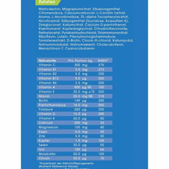 Maltodextrin, Magnesiumcitrat, Säuerungsmittel Citronensäure, Calciumcarbonat, L-Carnitintartrat, Aroma, L-Ascorbinsäure, DL-alpha-Tocopherylacetat, Nicotinamid, Süßungsmittel (Sucralose, Acesulfam K), Zinkgluconat, Kaliumcitrat, Calcium-D-pantothenat, Eisenfumarat, Kupferbisglycinat, Citrusbioflavonoide, Retinylacetat, Pyridoxinhydrochlorid, Thiaminmononitrat, Riboflavin, Lutein, Pteroylmonoglutaminsäure, Tomatenextrakt, D-Biotin, Chrom-III-chlorid, Kaliumjodid, Natriummolybdat, Natriumselenit, Cholecalciferol, Menachinon-7, Cyanocobalamin