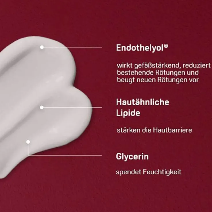 Die schnell einziehende und feuchtigkeitsspendende Tagespflege versorgt die Haut langanhaltend mit Feuchtigkeit und schützt sie zudem vor UVA- und UVB-Strahlung. Dank dem Wirkkomplex Endothelyol® wirkt die Pflege gefäßstärkend, reduziert klinisch belegt bestehende Rötungen und beugt neuen Rötungen vor. Zudem wirkt sie Reizungen und Entzündungsanzeichen entgegen und beruhigt die Haut sofort.