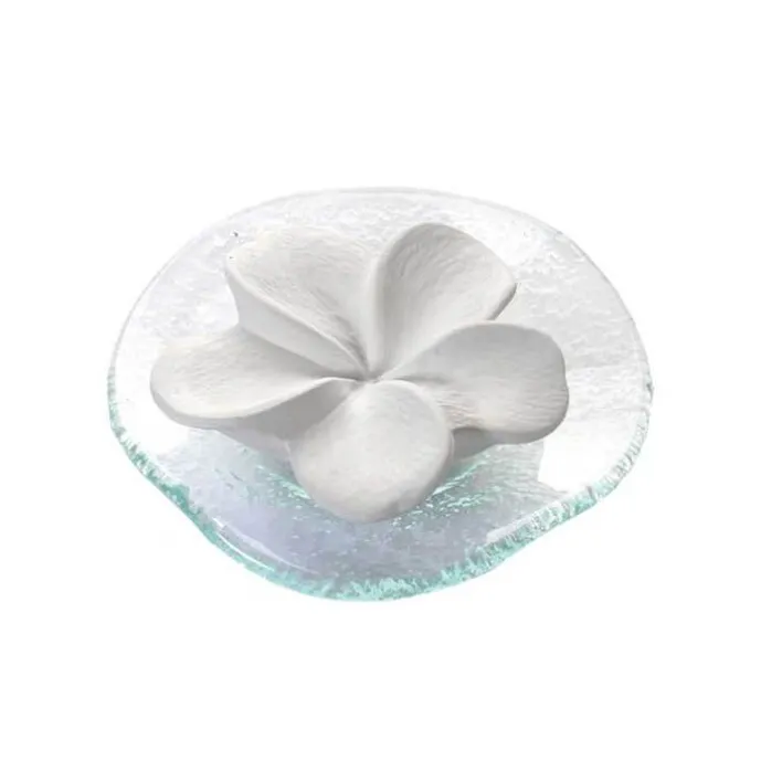 Der Duftstein Frangipani aus Keramik wird mit einem hübschen Glasteller als Untersatz geliefert.