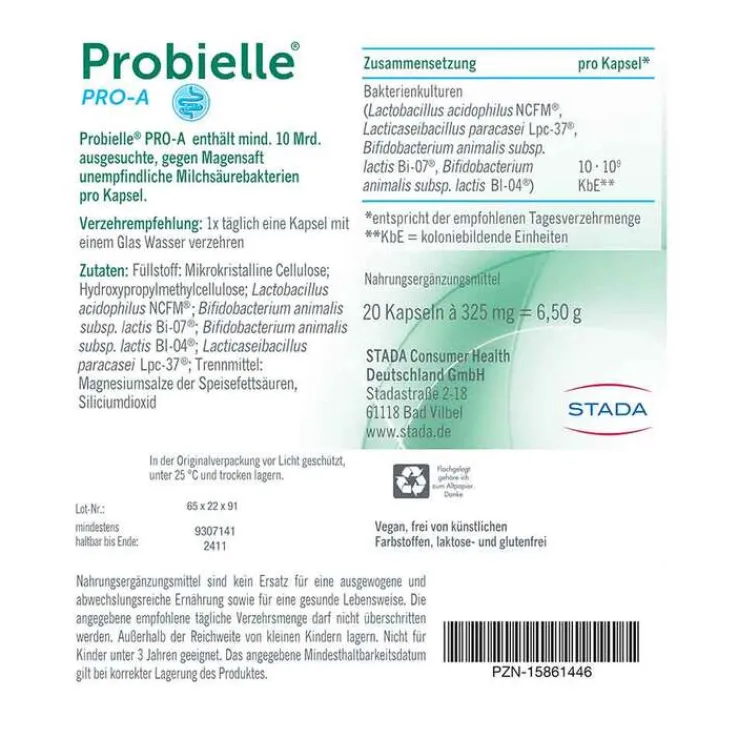 - Probielle Pro A enthält mindestens 10 Mrd. ausgesuchte, gegen Magensaft unempfindliche Milchsäurebakterien pro Kapsel