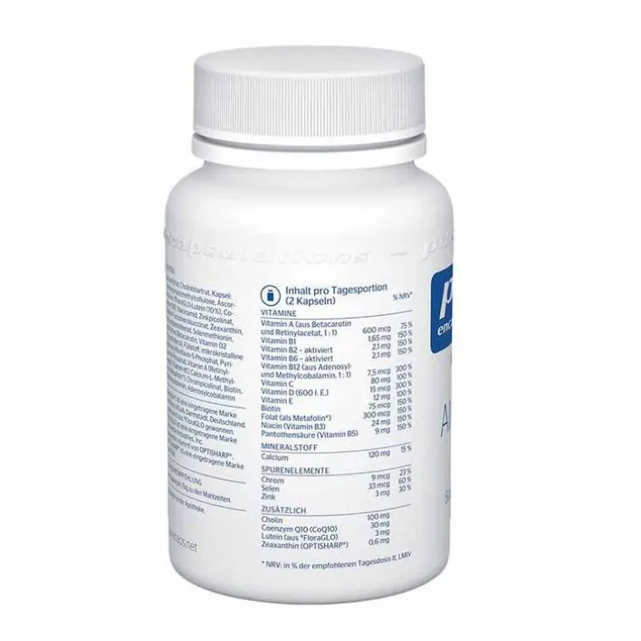 Calciumcitrat, Cholinbitartrat, Hydroxypropylmethylcellulose (Kapsel), Ascorbinsäure, Coenzym Q10, Lutein, Niacinamid, Zinkpicolinat, D-alpha-Tocopherolsuccinat, Zeaxanthin, Calciumpantothenat, Selenmethionin, natürliches Betacarotin, Ergocalciferol (Vitamin D2), Füllstoff: mikrokristalline Cellulose, Riboflavin-5-Phosphat, Pyridoxal-5-Phosphat, Retinylacetat, Thiamin HCl, Calcium-L-Methylfolat, Chrompicolinat, Biotin, Adenosylcobalamin, Methylcobalamin