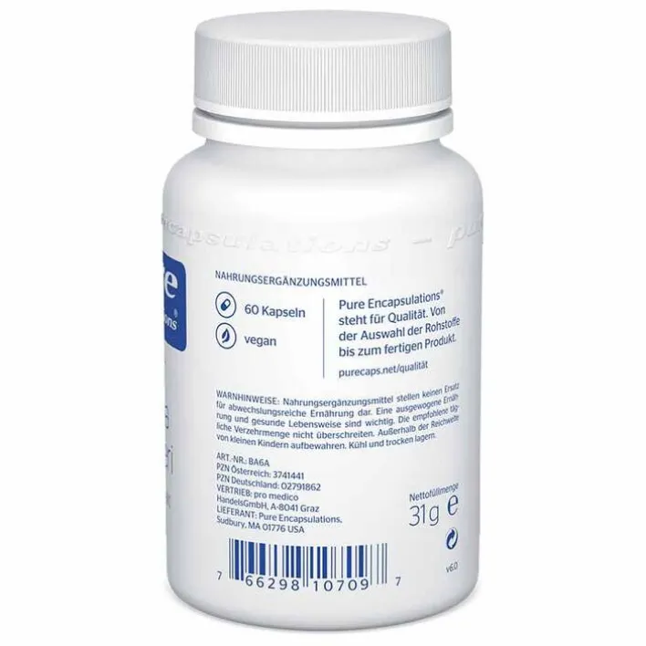 Pure Encapsulations® Bacopa monnieri basiert auf einer wissenschaftlich funiderten Rezeptur. Höchstmögliche Qualitätsstandards garantieren, dass die verwendeten Inhaltsstoffe maximal verträglich sind und eine optimale Bioverfügbarkeit aufweisen. Deshalb gelten wir auch weltweit als das Original bei naturidenten Verbindungen. Zum leichten Leben bedarf es wenig. Pure Encapsulations® Bacopa monnieri ist laktosefrei, fruktosefrei und glutenfrei. Auch auf künstliche Farb- und Geschmacksstoffe hat man bei Pure Encapsulations® verzichtet. Ganz rein eben.