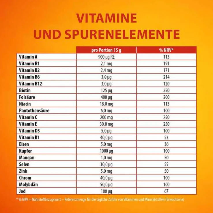 | * (% NRV = Nährstoffbezugswert – Referenzmenge für die tägliche Zufuhr von Vitaminen und Mineralstoffen (Erw.)) | ||