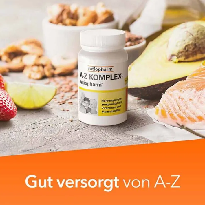 Damit unser Körper gut funktionieren kann, müssen ihm Vitamine, Mineralstoffe und Spurenelemente in ausreichender Menge zur Verfügung stehen. A-Z KOMPLEX ratiopharm® ist ein Nahrungsergänzungsmittel, das eine Versorgung mit den wichtigsten Vitalstoffen sicherstellt. Es enthält alle Vitamine plus 10 Mineralstoffe und Spurenelemente. Die Tabletten sind frei von Laktose, Gluten, Zucker und Gelatine. A-Z KOMPLEX ratiopharm® ist eine Vitalstoff-Kombination zur Rundumversorgung, mit der sich der tägliche Bedarf an allen Vitaminen und den wichtigsten Mineralstoffen schnell decken lässt. Aufgrund der Zusammensetzung ist die Einnahme von einer Tablette täglich ausreichend. A-Z KOMPLEX ratiopharm®: gut versorgt von A-Z.