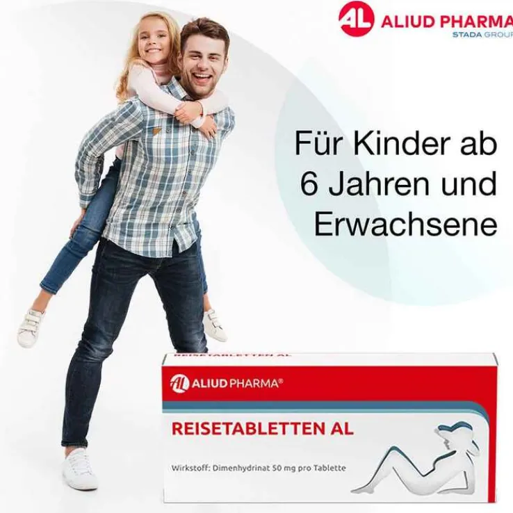 Mit der rechtzeitigen Einnahme eines dafür geeigneten Arzneimittels lässt sich den unliebsamen Beschwerden vorbeugen. REISETABLETTEN AL mit dem Wirkstoff Dimenhydrinat eignen sich sowohl zur Vorbeugung wie auch zur Behandlung der typischen Symptome der Reisekrankheit. REISETABLETTEN AL sind gut verträglich und bereits für Kinder ab 6 Jahren zugelassen. Die Tabletten sind mit einer Bruchkerbe versehen und lassen sich einfach in gleiche Dosen teilen.