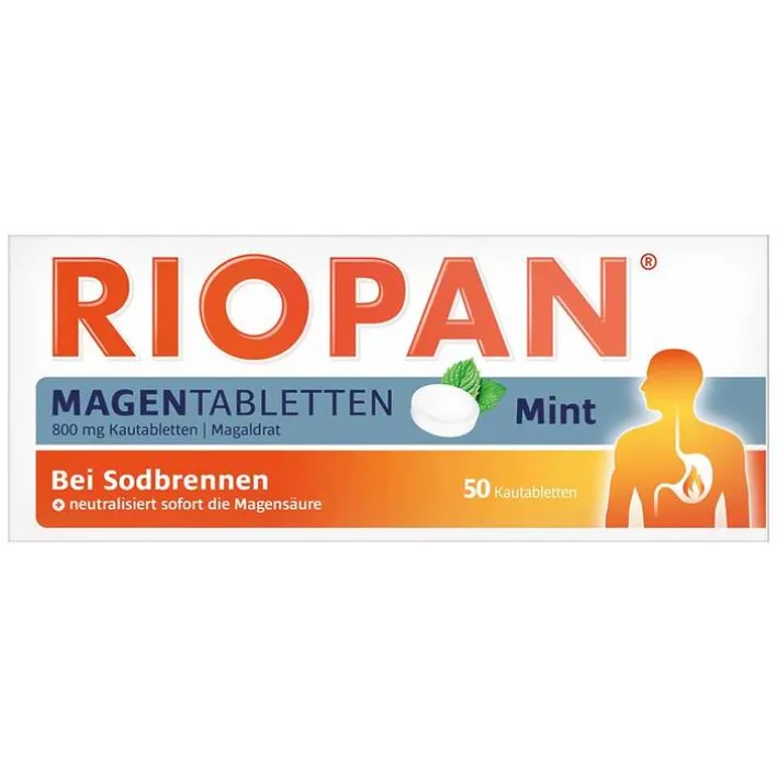 RIOPAN® Magen Tabletten Mint 800 mg Kautabletten: 1 Kautablette enthält 800 mg wasserfreies Magaldrat. Anwendung: Sodbrennen und säurebedingte Magenbeschwerden; symptomatische Behandlung von Magen- und Zwölffingerdarmgeschwüren. Warnhinweise: Enthält Sorbitol und Menthol. Packungsbeilage beachten. Weitere Hinweise siehe Fach- und Gebrauchsinfo. Zu Risiken und Nebenwirkungen lesen Sie die Packungsbeilage und fragen Sie Ihre Ärztin, Ihren Arzt oder in Ihrer Apotheke. Stand: 09/2019