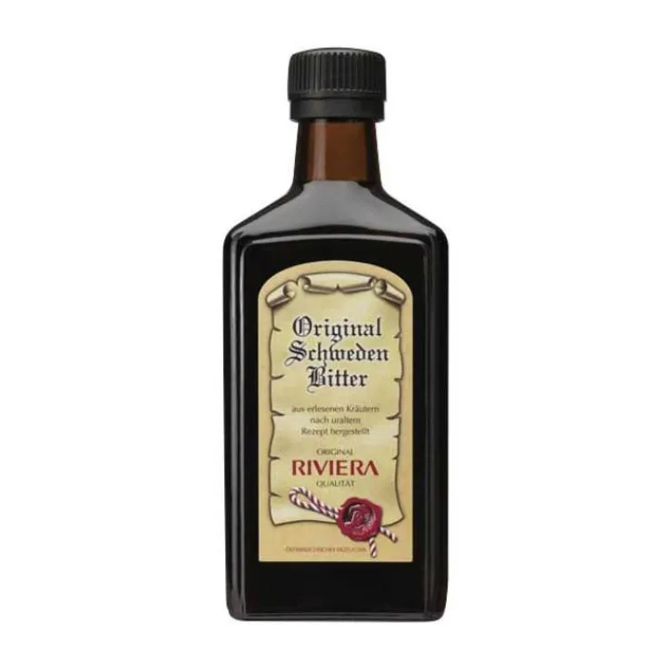 Original Schwedenbitter Riviera ist ein aus erlesenen Kräutern nach einem uralten Rezept hergestelltes Qualitätsprodukt. Die Bitterstoffe von Wermutkraut und Enzianwurzel sorgen für den typischen Geschmack.