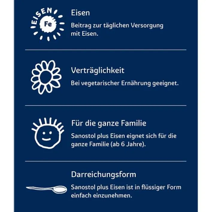 Sanostol plus Eisen enthält neben vielen wichtigen Vitaminen auch zweiwertiges Eisen, das besonders gut vom Organismus aufgenommen und verwertet werden kann. Eisen ist ein lebenswichtiges Spurenelement, das über die Nahrung in unseren Körper gelangt und dort hauptsächlich als Baustein in den roten Blutkörperchen vorkommt. Diese binden und transportieren den Sauerstoff mit Hilfe des Eisens.