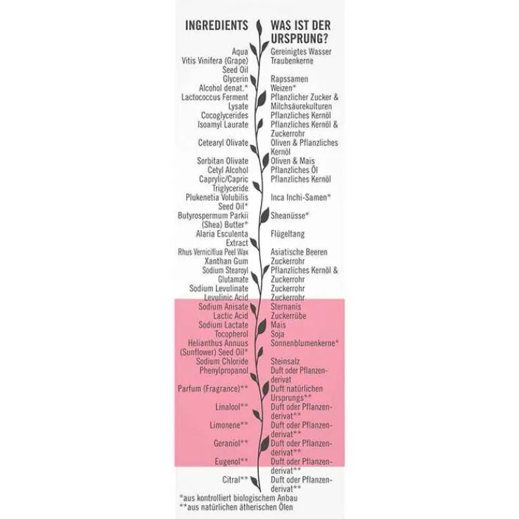 Aqua (Water), Vitis Vinifera (Grape) Seed Oil, Glycerin, Alcohol denat.*, Lactococcus Ferment Lysate, Cocoglycerides, Isoamyl Laurate, Cetearyl Olivate, Sorbitan Olivate, Cetyl Alcohol, Caprylic/Capric Triglyceride, Plukenetia Volubilis Seed Oil*, Butyrospermum Parkii (Shea) Butter*, Alaria Esculenta Extract, Rhus Verniciflua Peel Wax, Xanthan Gum, Sodium Stearoyl Glutamate, Sodium Levulinate, Levulinic Acid, Sodium Anisate, Lactic Acid, Sodium Lactate, Tocopherol, Helianthus Annuus (Sunflower) Seed Oil*, Sodium Chloride, Phenylpropanol, Parfum (Fragrance)**, Linalool**, Limonene**, Geraniol**, Eugenol**, Citral**