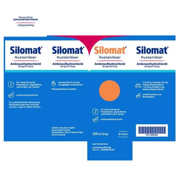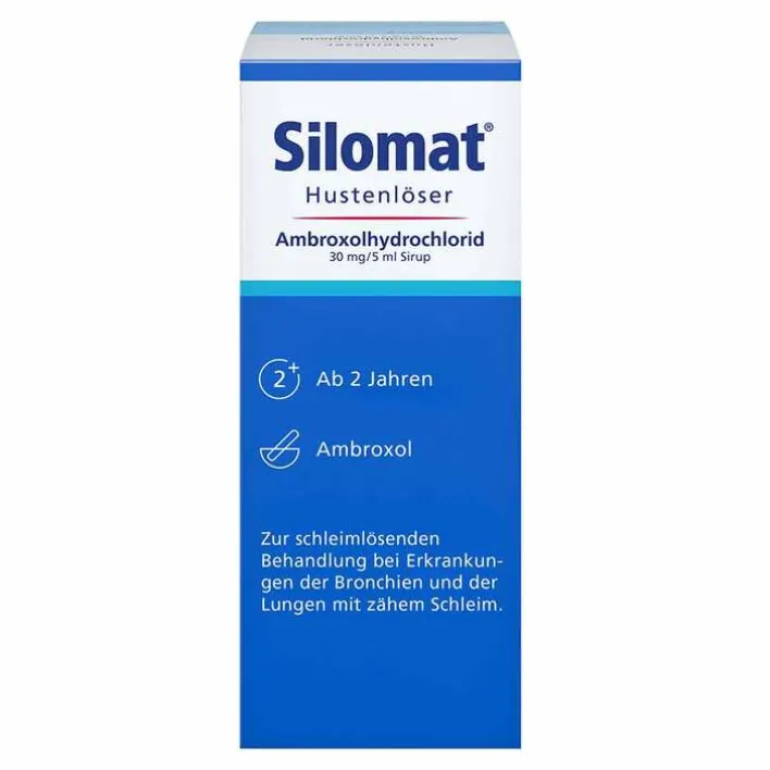 Silomat® Hustenlöser Ambroxolhydrochlorid 30 mg/5 ml Sirup. Zur Anwendung bei Erwachsenen, Jugendlichen und Kindern ab 2 Jahren. Wirkstoff: Ambroxolhydrochlorid. Anwendung zur schleimlösenden Behandlung bei Erkrankungen der Bronchien und der Lunge mit zähem Schleim. Wenn Sie sich nach 4 – 5 Tagen nicht besser oder gar schlechter fühlen, müssen Sie sich an einen Arzt wenden. Hinweis: Enthält Sorbitol und Benzoesäure. Zu Risiken und Nebenwirkungen lesen Sie die Packungsbeilage und fragen Sie Ihre Ärztin, Ihren Arzt oder in Ihrer Apotheke. STADA Consumer Health Deutschland GmbH, Stadastraße 2–18, 61118 Bad Vilbel Stand: August 2023