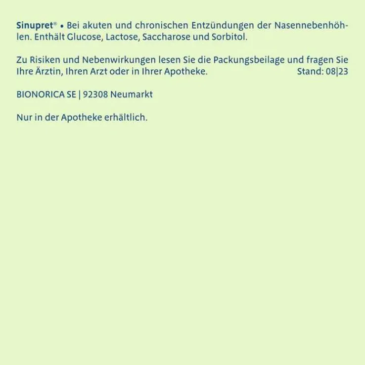Sinupret® Bei akuten und chronischen Entzündungen der Nasennebenhöhlen. Enthält Glucose, Lactose, Saccharose und Sorbitol. Zu Risiken und Nebenwirkungen lesen Sie die Packungsbeilage und fragen Sie Ihre Ärztin, Ihren Arzt oder in Ihrer Apotheke. Stand: 08|21 BIONORICA SE | 92308 Neumarkt; Mitvertrieb: PLANTAMED Arzneimittel GmbH | 92308 Neumarkt