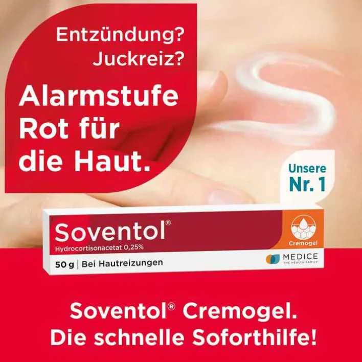Soventol® Hydrocortisonacetat 0,25% 2,5 mg/g Creme. Anwendungsgebiete: Zur Behandlung von entzündlichen und allergischen Dermatosen (Hautentzündungen und Ekzeme) mit geringer bis mittlerer Symptomausprägung, die auf eine äußerliche Behandlung mit schwach wirksamen Corticosteroiden ansprechen. Zu Risiken und Nebenwirkungen lesen Sie die Packungsbeilage und fragen Sie Ihre Ärztin, Ihren Arzt oder in Ihrer Apotheke. Stand 07/2022. MEDICE Arzneimittel, 58638 Iserlohn
