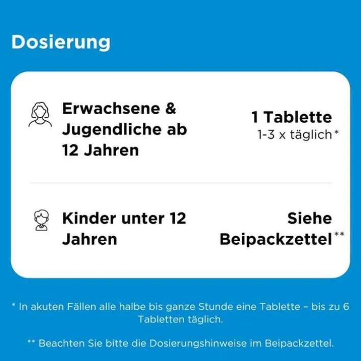 - Akutdosierung: Alle halbe bis ganze Stunde, höchstens 6-mal täglich, 1 Tabletten im Mund zergehen lassen.
