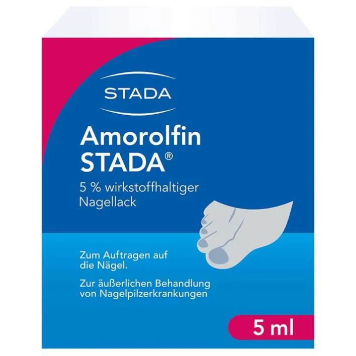 Amorolfin STADA® 5% wirkstoffhaltiger Nagellack. Wirkstoff: Amorolfin. Zur Behandlung bei Erwachsenen ab 18 Jahren von Pilzerkrankungen, die bis zu 2 Nägel und die vordere Hälfte oder die Ränder der Nägel betreffen. Hinweis: Dieses Produkt ist brennbar! Zu Risiken und Nebenwirkungen lesen Sie die Packungsbeilage und fragen Sie Ihre Ärztin, Ihren Arzt oder in Ihrer Apotheke. STADA Consumer Health Deutschland GmbH, Stadastraße 2-18, 61118 Bad Vilbel, Stand: Juli 2020