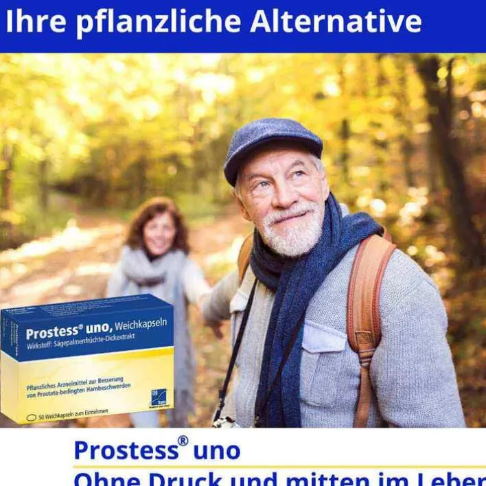 Prostess® uno, Weichkapseln. Wirkstoff: Sägepalmenfrüchte-Dickextrakt. Anwendungsgebiete: Beschwerden beim Wasserlassen bei einer gutartigen Vergrößerung der Prostata (Miktionsbeschwerden bei benigner Prostatahyperplasie Stadium I und II nach Alken bzw. II und III nach Vahlensieck). Hinweis: Prostess® uno bessert nur die Beschwerden bei einer vergrößerten Prostata, ohne die Vergrößerung zu beheben. Bitte suchen Sie daher in regelmäßigen Abständen Ihren Arzt auf. Insbesondere bei Blut im Urin oder bei akuter Harnverhaltung sollte ein Arzt aufgesucht werden. Warnhinweis: Arzneimittel enthält Sorbitol. Packungsbeilage beachten. Stand: Februar 2020. Zu Risiken und Nebenwirkungen lesen Sie die Packungsbeilage und fragen Sie Ihre Ärztin, Ihren Arzt oder in Ihrer Apotheke.