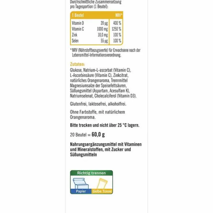 Glukose, Natrium-L-ascorbat (Vitamin C), L-Ascorbinsäure (Vitamin C), Zinkcitrat, natürliches Orangenaroma, Trennmittel Magnesiumsalze der Speisefettsäuren, Süßungsmittel (Aspartam, Acesulfam K), Natriumselenat, Cholecalciferol (Vitamin D3).